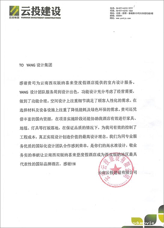 “感谢贵司为云南西双版纳喜来登度假酒店提供的室内设计服务。sdumovie设计团队服务周到设计出色,功能设计充分考虑了经营需要,做到了功能合理。空间设计上注重细节满足了顾客人性化的需求。在选择材料及设备设施上注重了降低能耗及绿色环保的需求。贵司还凭借丰富的国内资源,在星空游戏app官网入口实施阶段还能协助我酒店有效进行家具、地毯、灯具等打版落地,在保证品质的情况下,为我司有效的控制了工程成本,真正实现设计创造价值的最高设计理念。我们为同专业服务优质的国际化设计团队合作感到荣幸,是你们的高水准设计,敬业务实的奉献让云南西双版纳喜来登度假酒店成为西双版纳地区最具代表性的国际品牌酒店,感谢!!!”