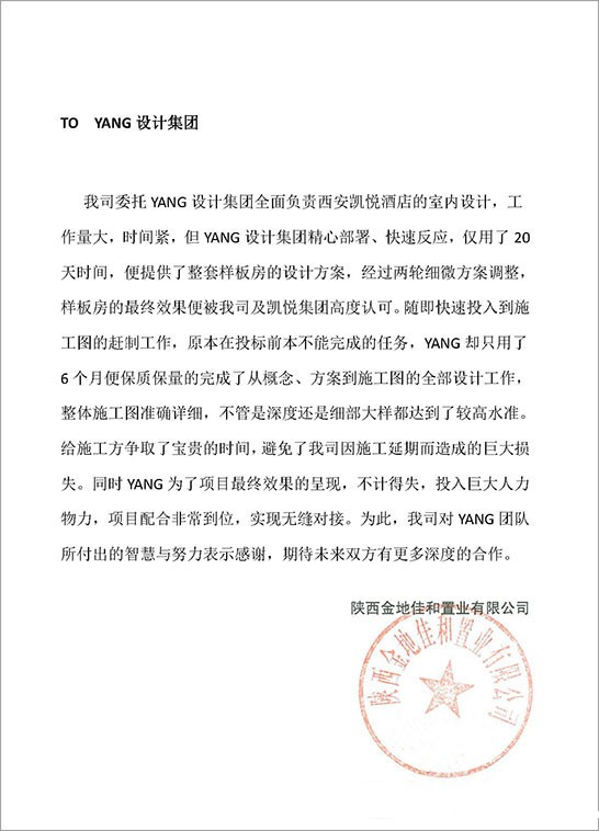 "我司委托sdumovie设计集团全面负责西安凯悦酒店的室内设计,工作量大,时间紧,但sdumovie设计集团精心部署、快速反应,仅用了20天时间,便提供了整套样板房的设计方案,经过两轮细微方案调整,样板房的最终效果便被我司及凯悦集团高度认可。随即快速投入到施工图的赶制工作,原本在投标前本不能完成的任务,sdumovie却只用了6个月便保质保量的完成了从概念、方案到施工图的全部设计工作,整体施工图准确详细,不管是深度还是细部大样都达到了较高水准。给施工方争取了宝贵的时间,避免了我司因施工延期而造成的巨大损失。同时sdumovie为了星空游戏app官网入口最终效果的呈现,不计得失,投入巨大人力物力,星空游戏app官网入口配合非常到位,实现无缝对接。为此,我司对sdumovie团队所付出的智慧与努力表示感谢,期待未来双方有更多深度的合作。"